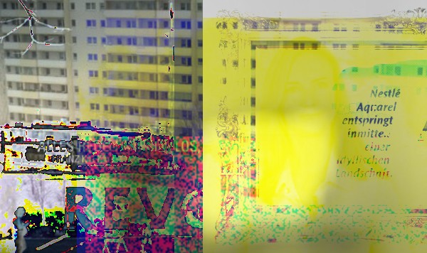 Kunst auf Knopfdruck. Diese Bilder sind mit dem „Net Art Generator" von Cornelia Sollfrank und Bildmaterial aus der Neuen Gegenwart entstanden.