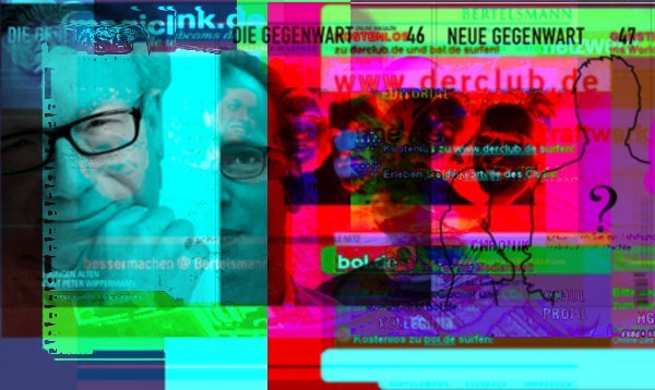 Kunst auf Knopfdruck. Diese Bilder sind mit dem „Net Art Generator" von Cornelia Sollfrank und Bildmaterial aus der Neuen Gegenwart entstanden.
